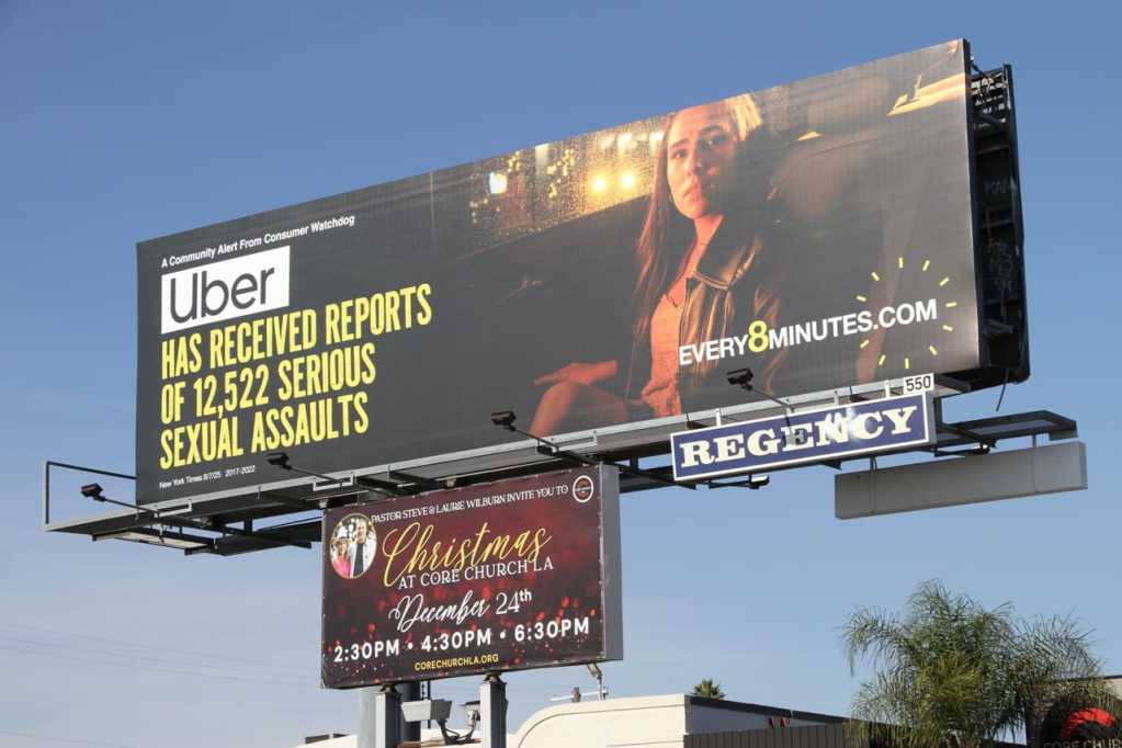 Los Angeles, CA — Consumer Watchdog has sponsored dozens of billboards across California warning the public about Uber’s failure to deal with rampant claims of sexual assault and misconduct.
