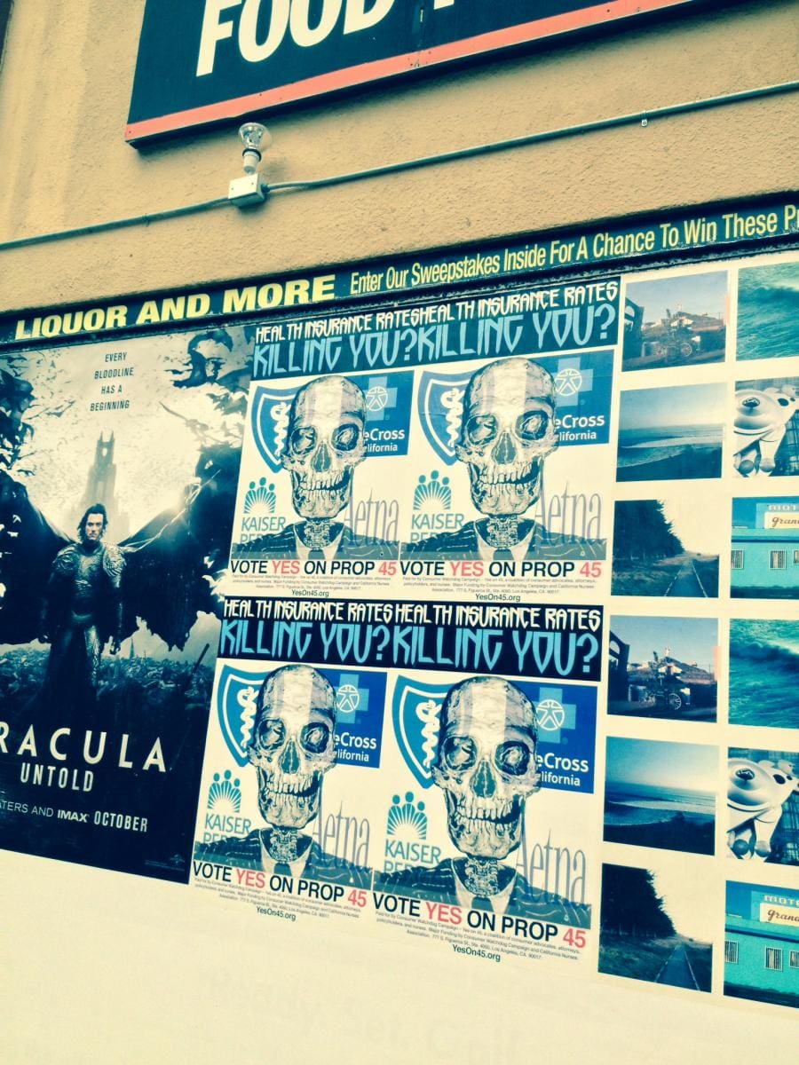 San Francisco, CA – Consumer advocates and nurses launched a new “Yes on 45” street art campaign hitting San Francisco and Sacramento this week that exposes the health insurance companies spending $37.5 million to oppose Proposition 45. Thousands of posters will be plastered through wild-posting in the coming days in other cities across the state.
