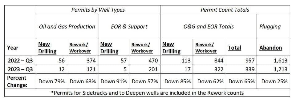Overall, permitting slowed in the third quarter of 2023 over the year before, falling 65%. (See Table 1 below). For a complete permit update, see: https://newsomwellwatch.com