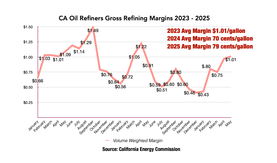 Sacramento, CA – California oil refiners’ profits per gallon grew in May to top $1 per gallon, according to new data posted by the California Energy Commission (CEC).
