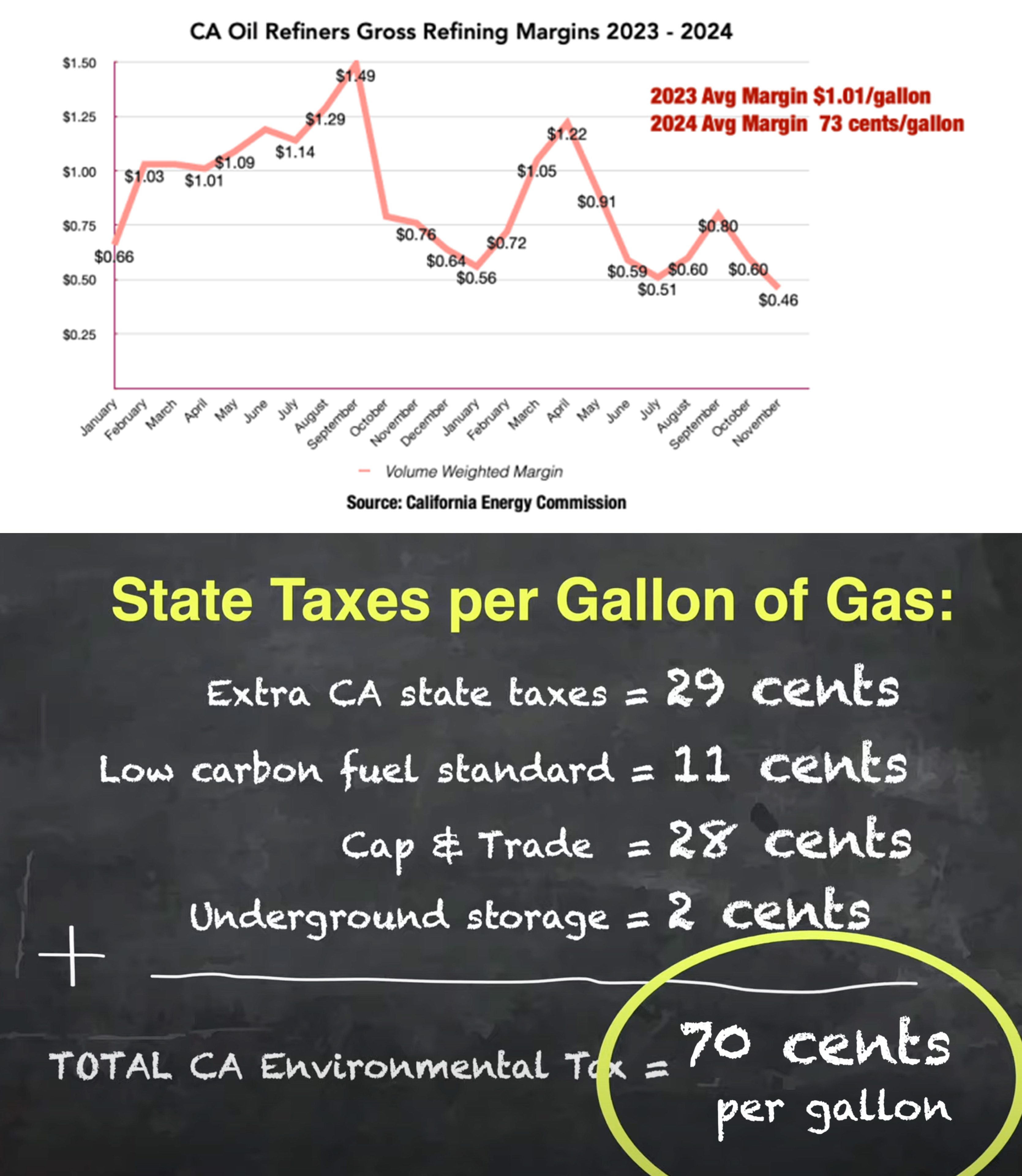 Since 2023, California required oil refiners to publish how much gross profits they make per gallon thanks to SB 1322, authored by Senator Ben Allen and sponsored by Consumer Watchdog. The public reporting shows the refiners made more than $1 per gallon on average in 2023, and their profits only shrunk in 2024 after the implementation of the special session reforms. By comparison, Californians spend about 70 cents more per gallon in added state taxes and environmental costs, which are all well documented. These cost pays for our roads, why is we have “freeways” rather than highways, and our cleaner air. By contrast, the oil refiners’ profits goes right into their pockets.