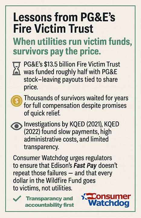 Consumer Watchdog will monitor whether Fast Pay conforms to the letter and spirit of AB 1054 — and ensure ratepayer contributions serve victims, not utility liability minimization.