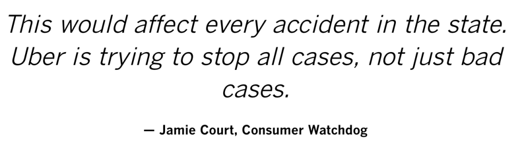 “This would affect every accident in the state,” says Jamie Court, the president and chairman of Consumer Watchdog, the California-based consumer advocacy organization. “Uber is trying to stop all cases, not just bad cases.”