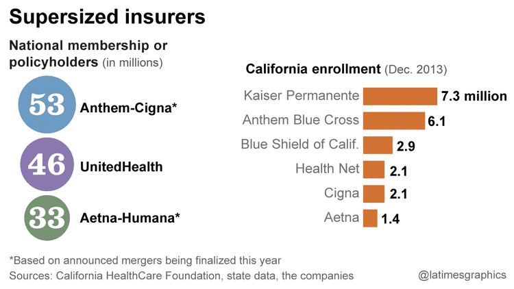 Anthem Inc. is trying to buy Cigna Corp. for $54.2 billion, and Aetna Inc. wants to take over rival Humana for $37 billion. Anthem and Aetna would join UnitedHealth Group Inc. atop the industry. Another deal, Centene's $6.8-billion acquisition of Woodland Hills insurer Health Net Inc., will also affect Californians.