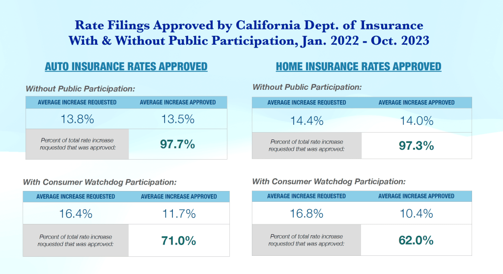 For auto insurance cases, companies got 71% of the rate requested when Consumer Watchdog intervened and 97% of the rate when it was just the Department.