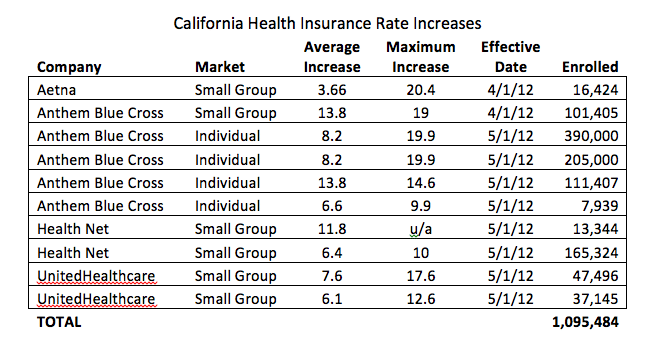 Four health insurance companies – Aetna, Anthem Blue Cross, Health Net and UnitedHealthcare – have raised rates for Californians with individual and small business health plans this month. The average rate increase is between 3.66 and 13.8 percent, and will reach as high as 20.4% for some patients.