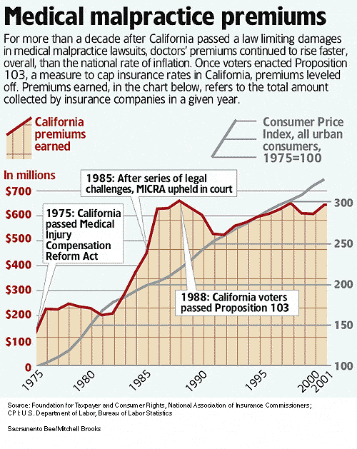 Medical malpractice insurance premiums increased 450% in California in the thirteen years after liability limits were enacted. However, in the first three years after insurance rate regulation was approved, malpractice premiums fell 20% and then stabilized even as premiums across the country continued to fluctuate.